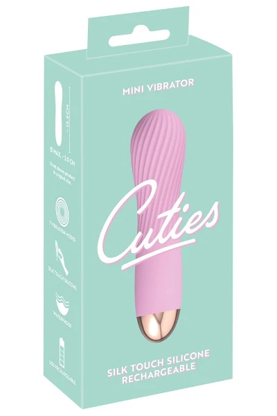 Roze mini vibrator met een opwindende gegroefde textuur en een fluweelzachte textuur. Deze mini vibrator is van de tweede generatie Cuties. Met 7 verschillende vibratiestanden. Hij kan worden opgeladen met de meegeleverde USB-kabel. Eenvoudig in gebruik en in een elegant design. Waterbestendig.