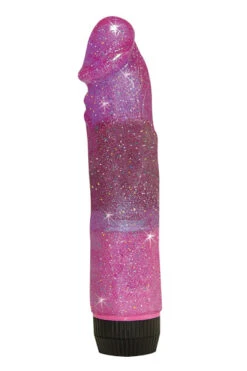 Schittering voor uw slaapkamer. Deze handige en slanke vibrator gemaakt van gladde transparante paarse gelei met glitterdeeltjes verwent zich met zijn stille multi-speed vibraties anaal en vaginaal. Afmeting: 18 cm, Ø 3,5 cm. Materiaal: PVC, ABS. Batterijen a.u.b. apart bestellen: 2 x AA.