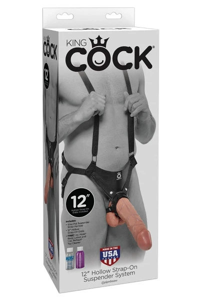 Afneembare penisvormige dildo aan een comfortabel zwart harnas (verstelbaar) met beugels. De penisvormige dildo is hol waardoor de penis kan worden ingebracht.
