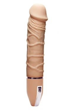 Deze ietwat flexibele, huidkleurige, penisvormige vibrator is bijna beter dan de echte vibrator, omdat zijn grote eikel, uitgesproken aderen en 10 krachtige vibratiestanden met een druk op de knop je zullen plezieren tot je een verbazingwekkende climax bereikt ! Volledige lengte 26 cm, insteekdiepte 18 cm, Ø 4,2-5 cm. Materiaal: siliconen, ABS. Batterijen a.u.b. apart bestellen: 3 x AA.