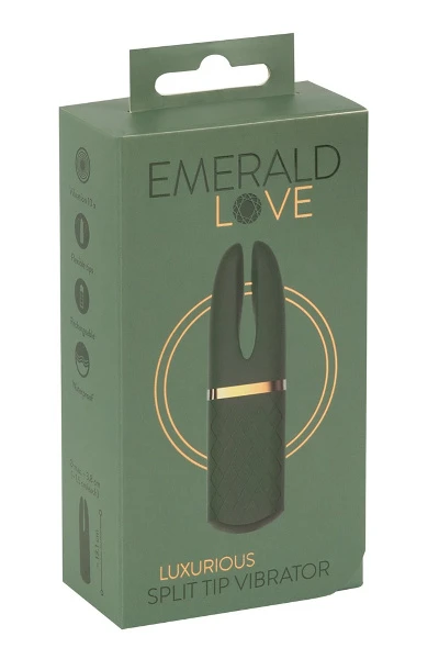 De mini/oplegvibrator Luxe Split Tip Vibrator van Emerald Love heeft een prachtig design en heeft een uitgesproken, antislip ruitpatroon en 2 beweegbare armen die perfect zijn voor spot-on genotsplek stimulatie (bijv. clitoris , tepel-, testikel- en perineumstimulatie). De 10 vibratiestanden zorgen voor veel afwisseling en zijn met een druk op de knop eenvoudig in te stellen. De vibrator is waterdicht wat betekent dat je er zowel in bad als onder de douche van kunt genieten! De fluweelzachte textuur op beide armen voelt heerlijk aan op de huid tijdens stimulatie en genot. Hij kan worden opgeladen met de meegeleverde USB-kabel.