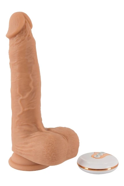 Een stotende vibrator in een realistische penisvorm met een sterke zuignap die op elk glad oppervlak blijft plakken. De zuignap maakt handsfree plezier mogelijk. De 7 vibratiestanden en 5 stuwstanden zijn afzonderlijk te bedienen via de afstandsbediening of door een partner. Dankzij de slimme geheugenfunctie onthoudt de vibrator de laatste trilstand die werd gebruikt voordat hij werd uitgeschakeld en start hij op deze trilstand wanneer hij weer wordt aangezet. De stotende en vibrerende genotsgever is bedekt met zachte siliconen die heerlijk aanvoelt op de huid. Hij kan worden opgeladen met de meegeleverde USB-kabel. Inclusief batterij (23A) voor de afstandsbediening.