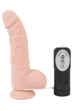 Deze realistische vibrator valt op door zijn buitengewoon intense pulsatie- en vibratiefuncties in 8 standen, die eenvoudig te bedienen zijn met de afstandsbediening aan een draad. Het voelt bijna als het echte door zijn realistische prominente eikel, aders en testikels. De zuignap maakt handsfree plezier mogelijk. Batterijen apart bestellen (4 x AAA).