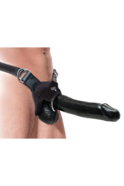 Realistische, holle dildo met uitpuilende testikels en een rekbaar voorbindharnas. Het kan op de penis worden gedragen voor meer lengte en omtrek of worden gebruikt voor hot pegging-plezier. Het voorbindharnas is verstelbaar.