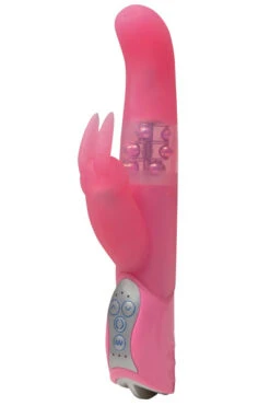 Parelvibrator met een links- / rechtsgestuurde rotatie en een konijntje-vormige clitorisstimulator. De 3 niveaus van rotatie en 7 niveaus van trillingen kunnen afzonderlijk worden bediend met een druk op de knop. Roze. Lengte 26 cm, Ø 4,1 cm. Materiaal: siliconen. (Batterijen a.u.b. apart bestellen: 3 x AA).