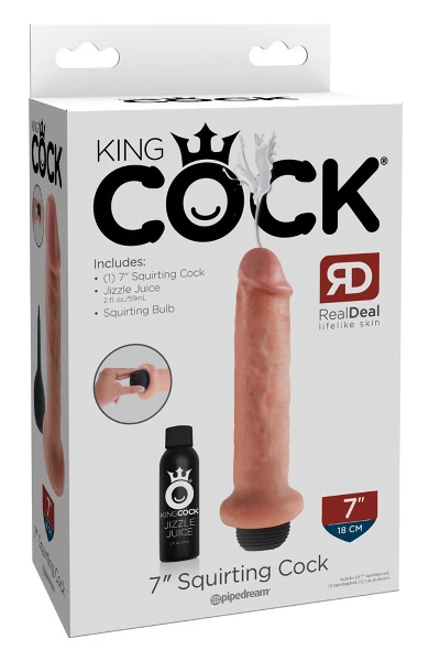 Deze extreem realistische dildo kan spuiten als het echte werk. De pompbal wordt gevuld met vloeistof en de as wordt vervolgens ingebracht. Wanneer er druk wordt uitgeoefend op de pompbal, begint de gekozen vloeistof uit de eikel te spuiten. Bevat 59 ml Jizzle Juice (nepsperma) en 29 ml toycleaner.