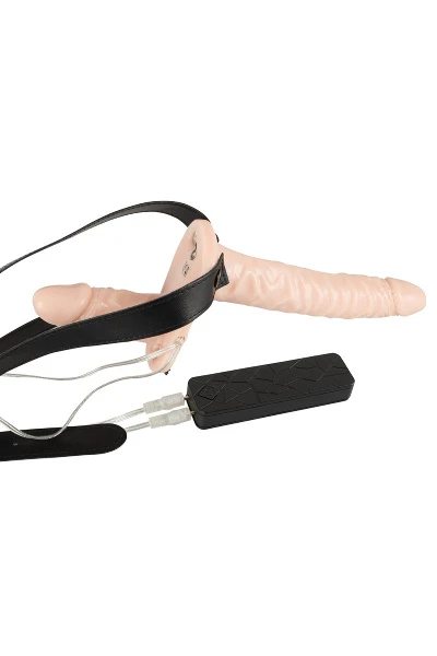 Strap-on harnas / string met een dubbele vibrator voor lesbische duwplezier en pegging met hem terwijl de drager wordt bevredigd door de andere vibrator. Stevige vibrators in een realistische penisvorm met uitgesproken eikel. Het verstelbare voorbindharnas / koord (heupomtrek max. 120Â cm, snaar max. 64Â cm) houdt de dubbele vibrator stevig op zijn plaats. De 2 motoren hebben 10 verschillende vibratiestanden en zijn eenvoudig in te stellen met de afstandsbediening aan een snoer. (Batterijen a.u.b. apart bestellen: 3 x AAA).