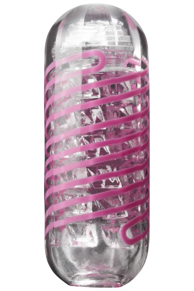 Transparante, herbruikbare masturbator met een geïntegreerde spoel die ervoor zorgt dat de masturbator gaat draaien tijdens penetratie (Internal Coil Mechanism). De pleziertunnel heeft een uitgesproken textuur van binnen.