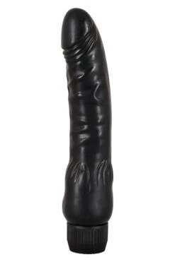 Het perfecte speeltje voor liefhebbers van leer en latex! Pitch-black en krachtige vibrator met enorme eikel en kloppende aderen. Zacht en glad materiaal voor een gemakkelijke penetratie en een realistisch seksgevoel. Met vibraties met meerdere snelheden. Afmeting: 22 cm, Ø 3-4 cm. Materiaal: PVC, ABS. Batterijen a.u.b. apart bestellen: 2 x AA.