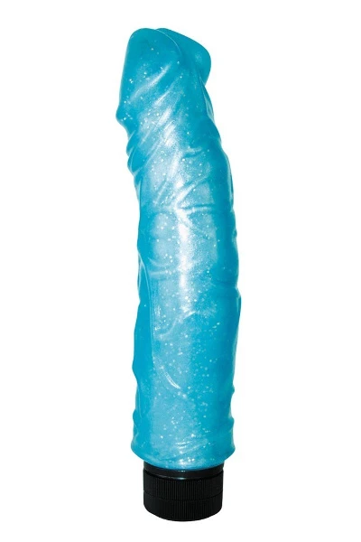 Vibrator met uitgesproken aders gemaakt van soepel glijdend jelly-materiaal met glitterdeeltjes. Met vibraties met meerdere snelheden. Afmeting: 20,5 cm, Ø 4,5-5 cm. Materiaal: PVC, ABS. Batterijen a.u.b. apart bestellen: 2 x AA.