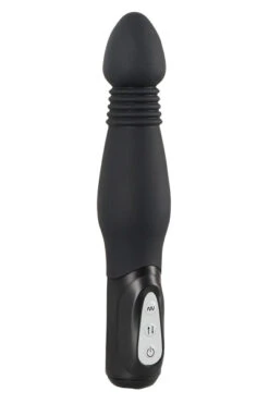 De anale vibrator heeft een kegelvormige punt en een uitpuilende schacht. Het heeft ook 7 vibratiestanden en 3 stuwsnelheden die afzonderlijk kunnen worden geregeld. Zwart.